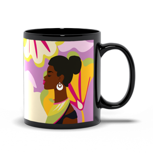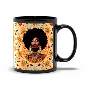 • Floral & Diamond Glam - African American Woman - Black Coffee Mug